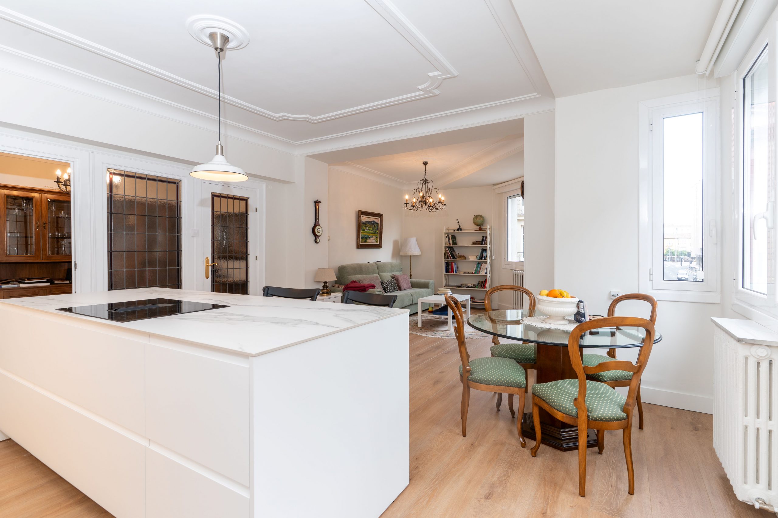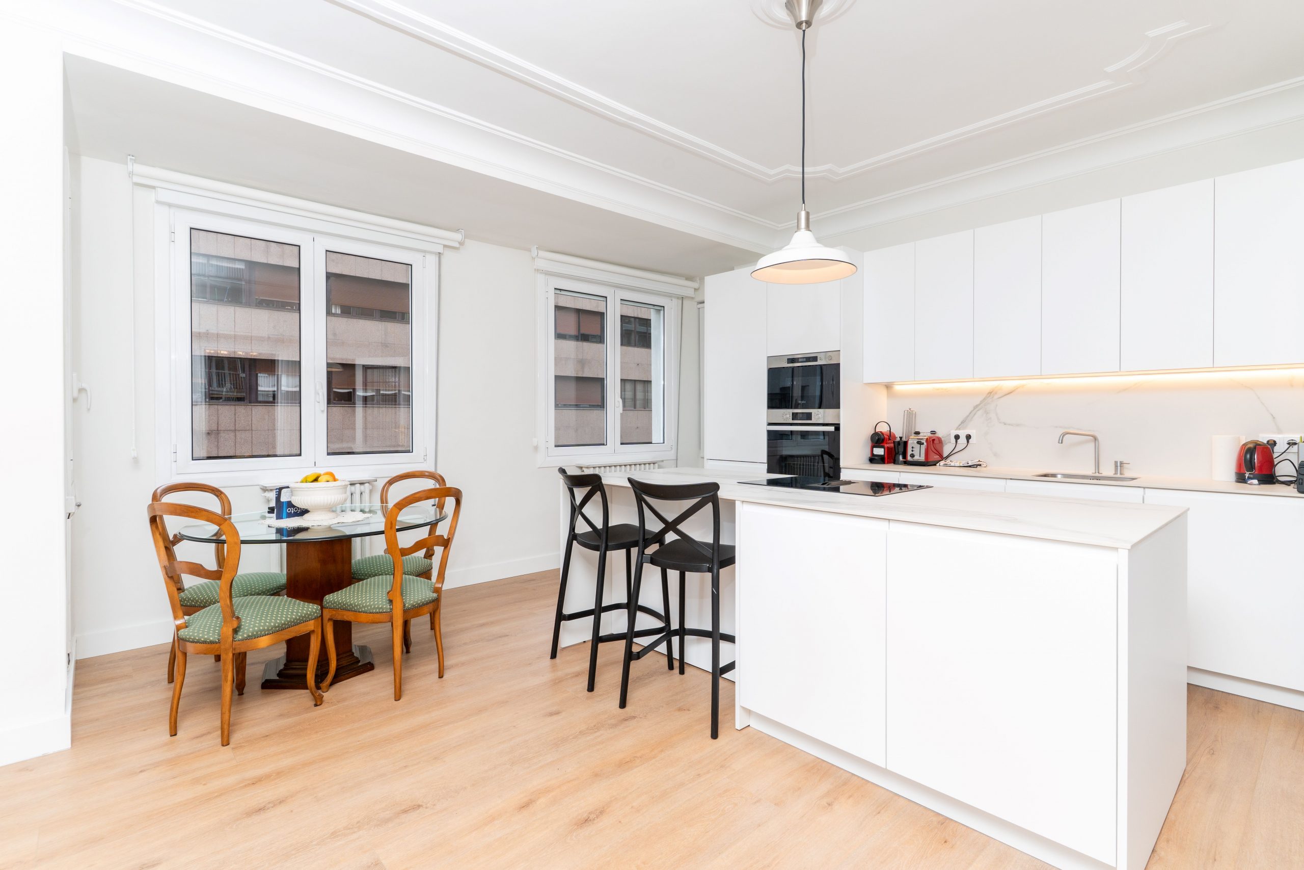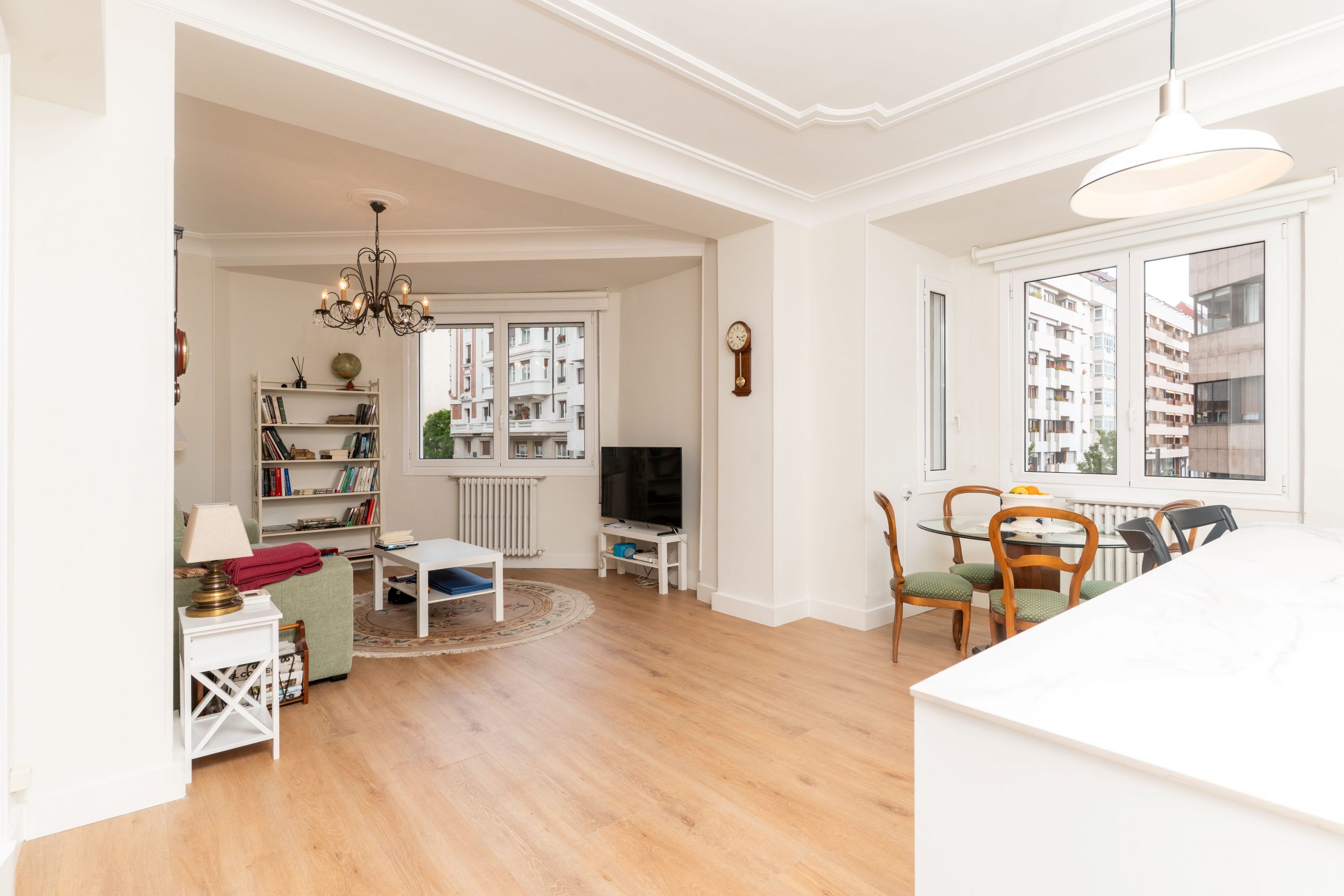 Todas las estancias, excepto una habitación orientada a un patio de luces, son exteriores y gozan de excelente luz natural gracias a su orientación este. Las ventanas de aluminio con doble acristalamiento Climalit y sistema oscilobatiente aseguran un óptimo aislamiento térmico y acústico, y la habitación principal cuenta además con contraventanas. Los suelos de madera aportan calidez, mientras que los baños y la cocina cuentan con acabados cerámicos de fácil mantenimiento.