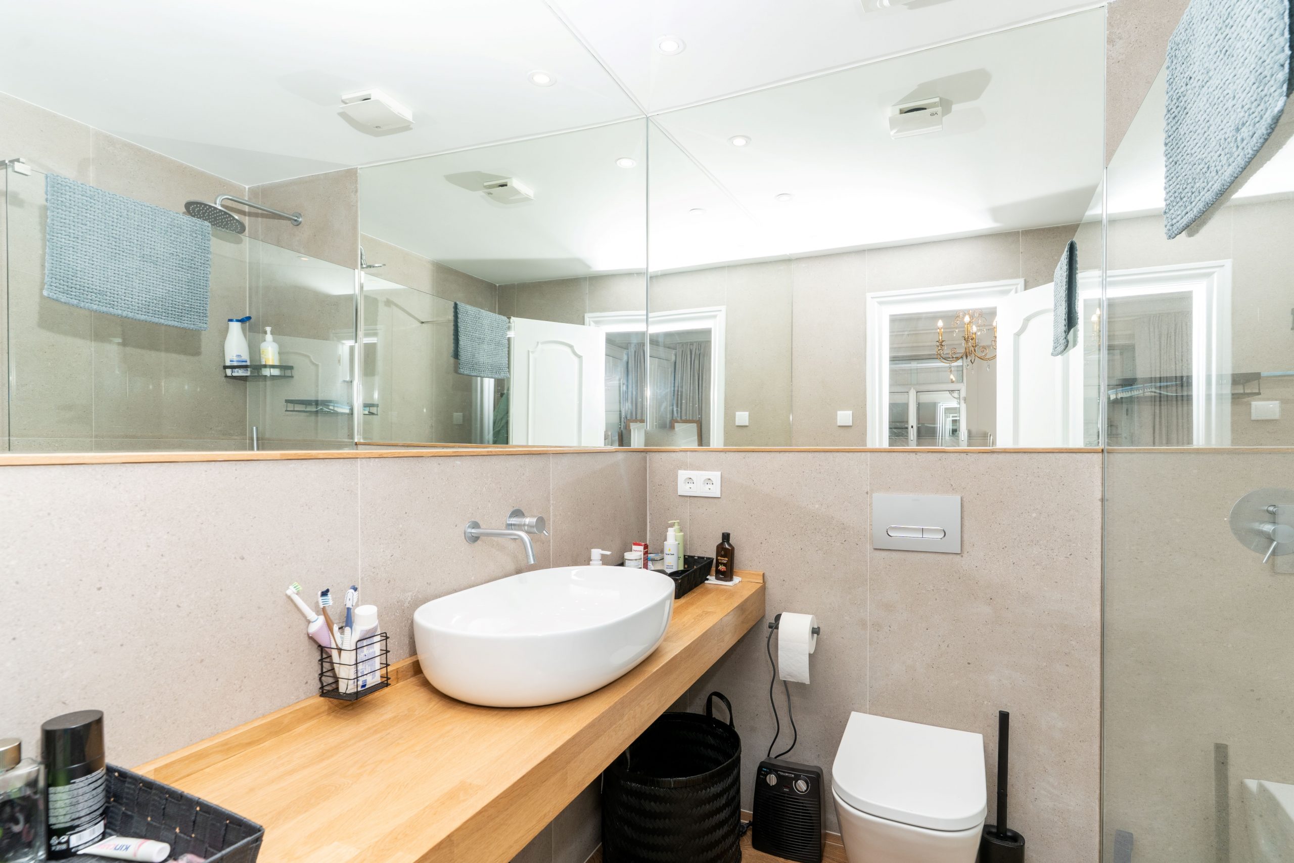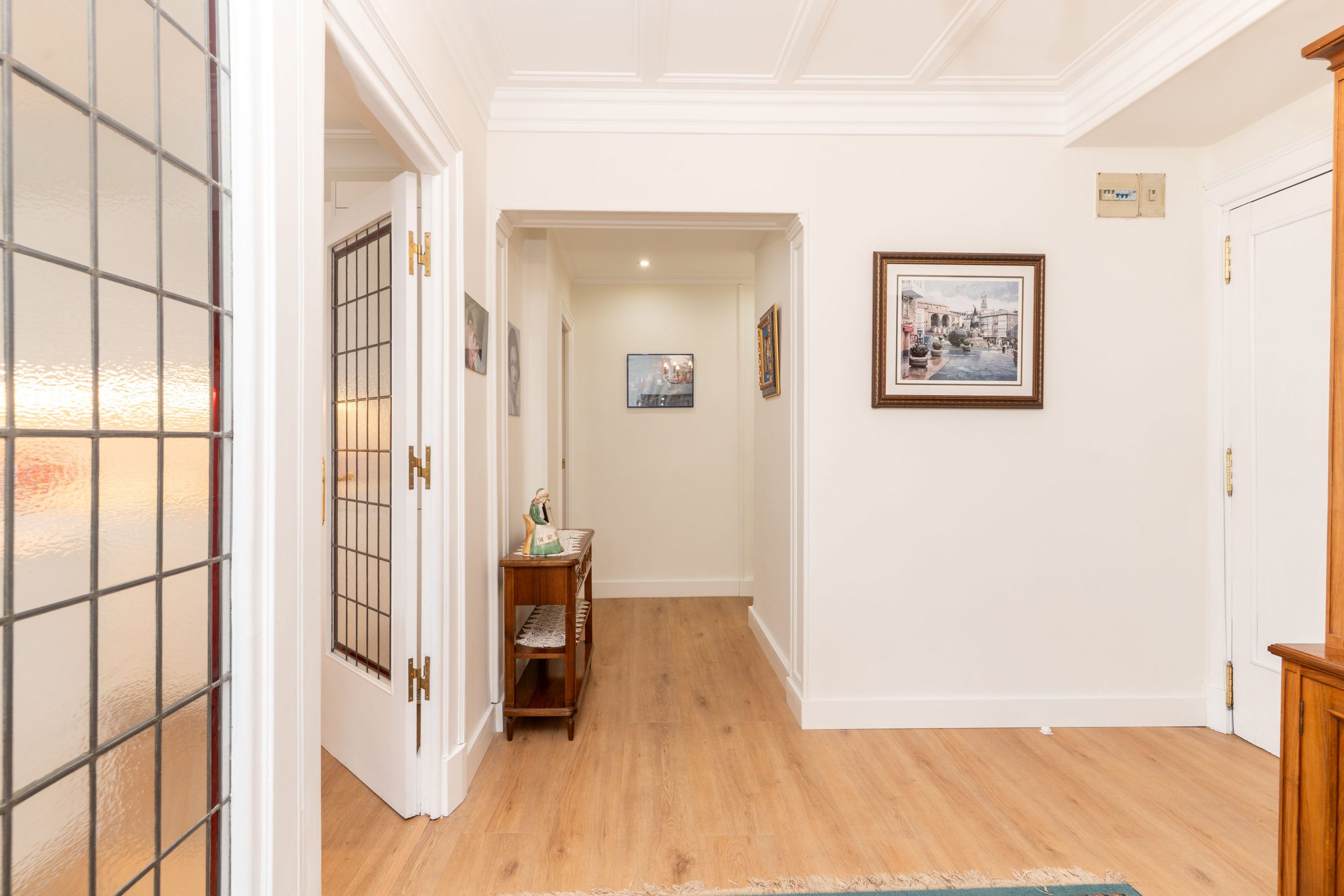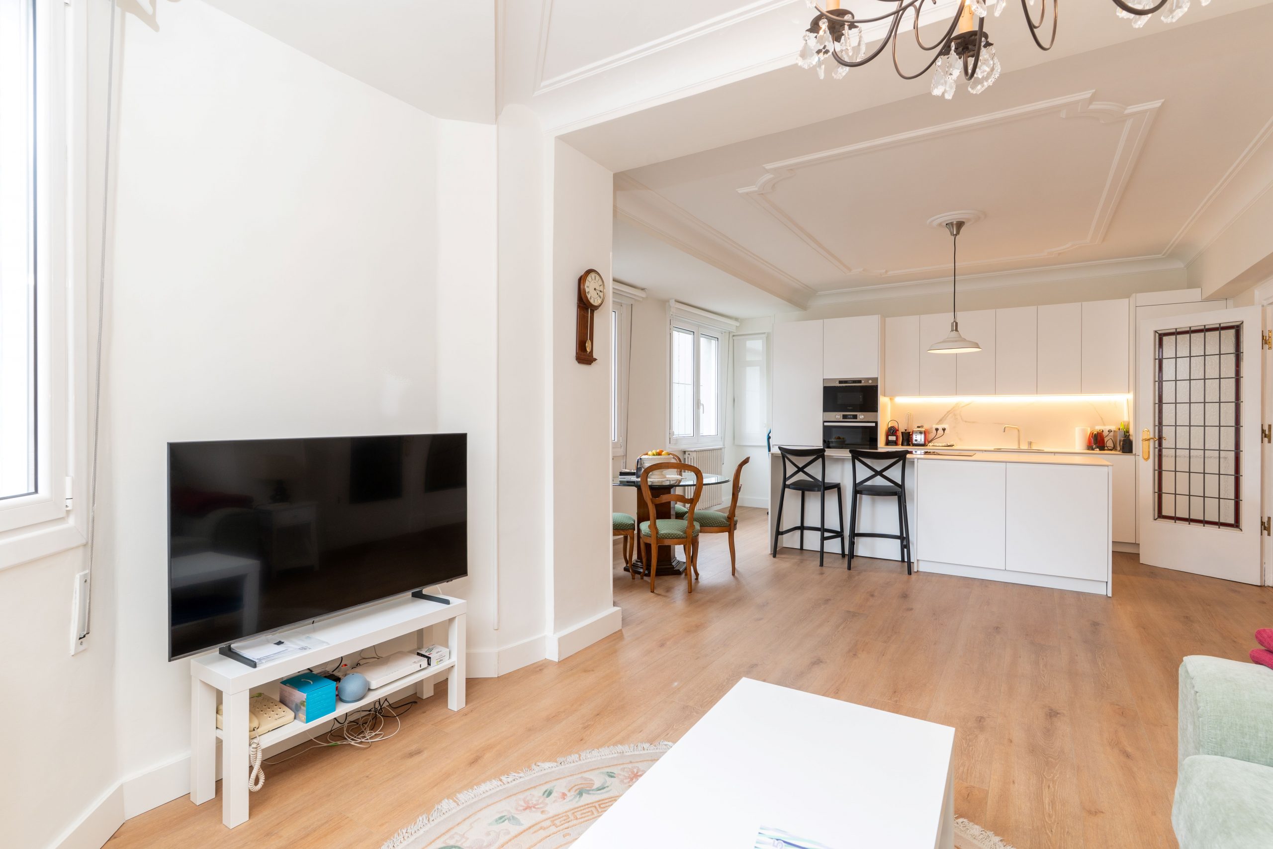 Todas las estancias, excepto una habitación orientada a un patio de luces, son exteriores y gozan de excelente luz natural gracias a su orientación este. Las ventanas de aluminio con doble acristalamiento Climalit y sistema oscilobatiente aseguran un óptimo aislamiento térmico y acústico, y la habitación principal cuenta además con contraventanas. Los suelos de madera aportan calidez, mientras que los baños y la cocina cuentan con acabados cerámicos de fácil mantenimiento.