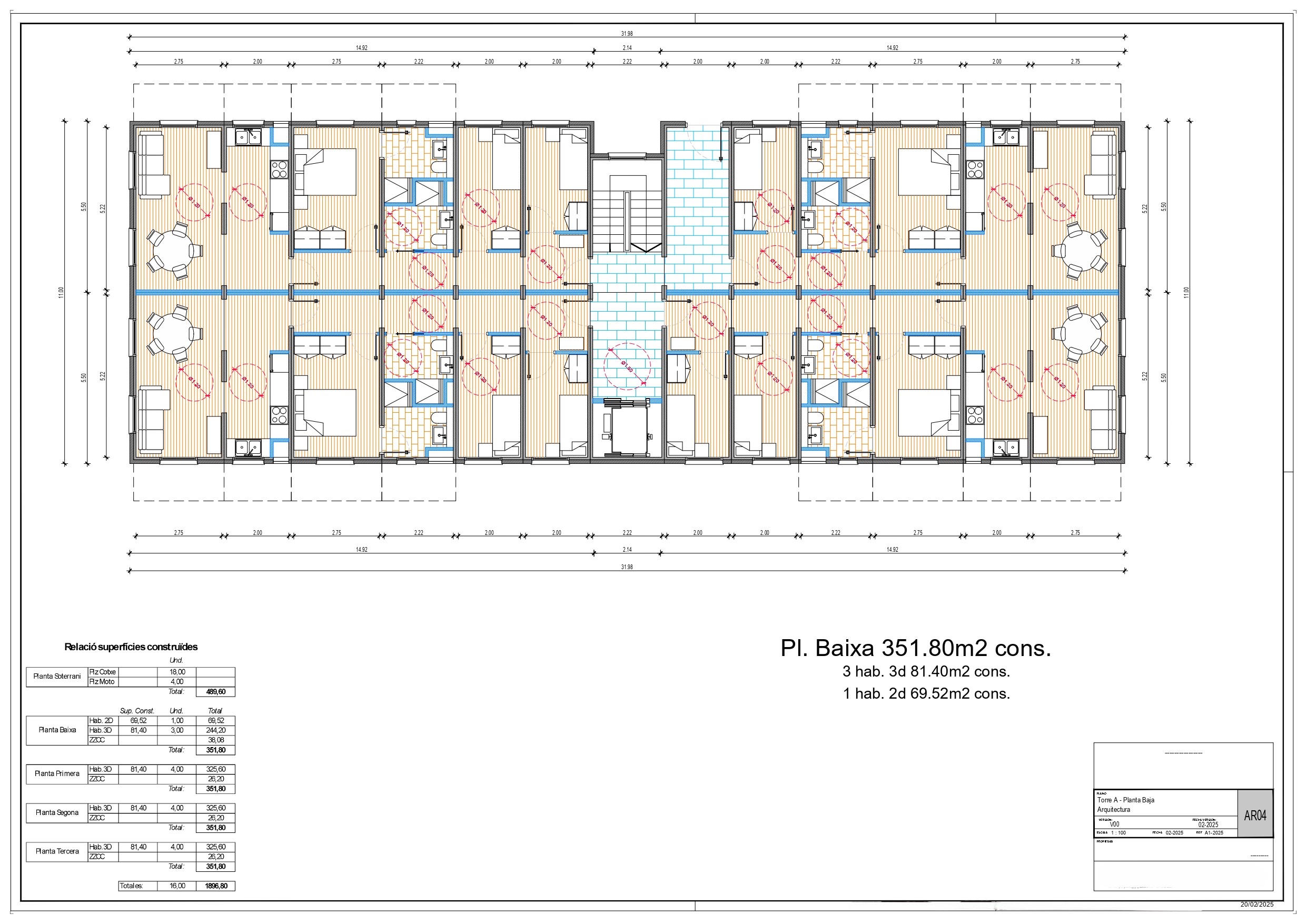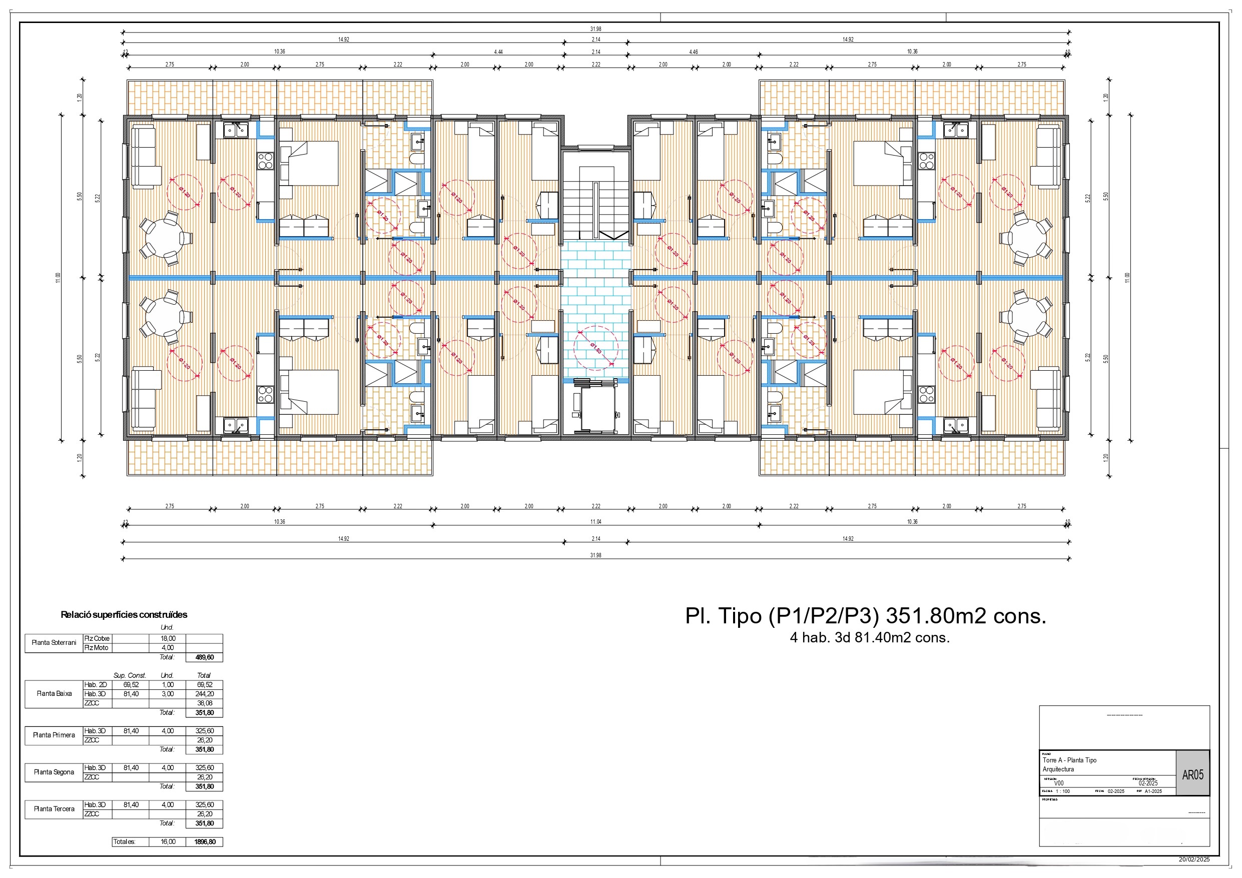 -El pre proyecto contempla la edificación de quince (15) unidades residenciales de 81,40 m² cada una, distribuidas en tres dormitorios y dos baños, así como una (1) unidad adicional de 69,52 m², distribuida en dos dormitorios y dos baños. Todas las unidades incluyen una plaza de aparcamiento y un trastero vinculados, garantizando así el cumplimiento de los estándares funcionales y de confort previstos